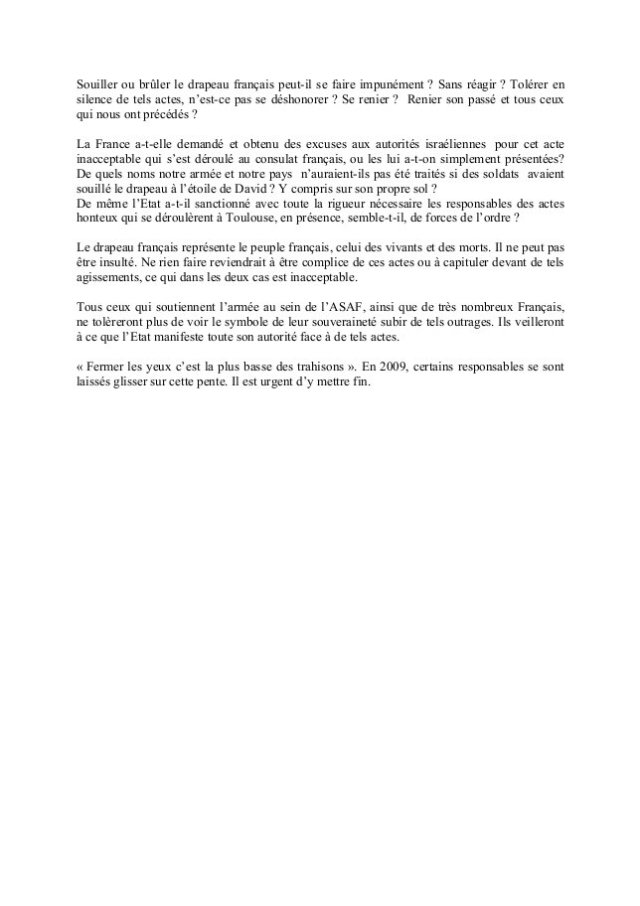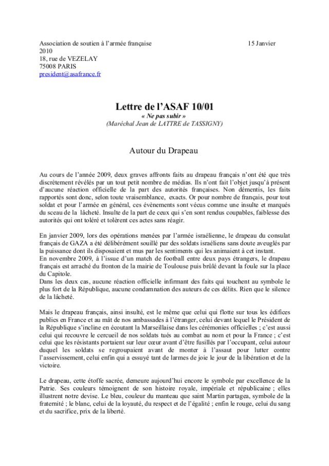 ASAF lettre ouverte : drapeaux qui brûlent .. Mardi 2 février 2010, par MORA , popularité : 4% Communiqués d’Associations | 2 | Actualités associations| Communiqués de Presse| .. reçu par mail .. Communiqué de l’ASAF en date du 15 janvier 2010 au sujet des drapeaux français qui brûlent....