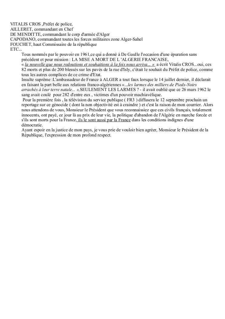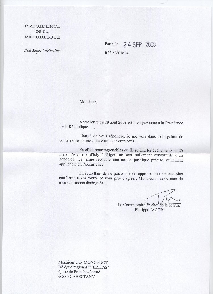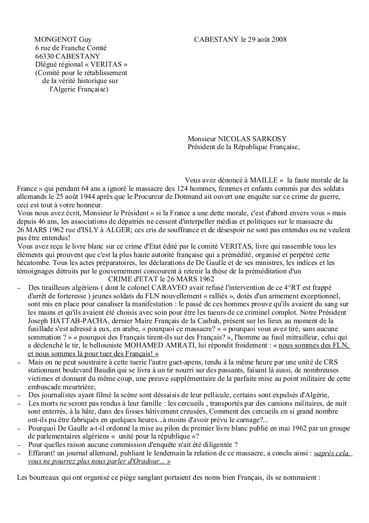 Lettre à Mr SARKOZY et la réponse Jeudi 25 septembre 2008, par MORA , popularité : 4% Espace Public | 14 | 26 mars 1962| ALGER| Tribune| Et la réponse :