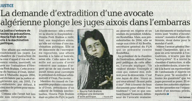 Houria Freh Brahim, avocate oranaise qui a toujours été un pilier du FLN accusée de corruption embarrasse les juges de la cour d’appel d’Aix-Marseille avec sa demande d’asile politique.
