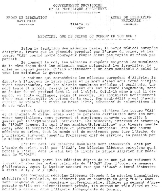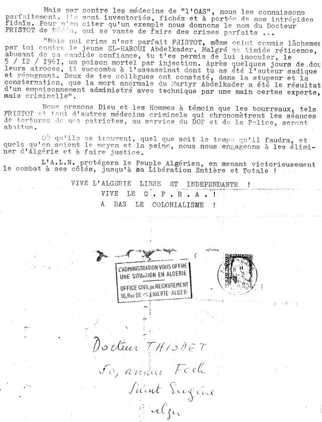 Je dois tout de même signaler que cette aventure que je n’avais, certes, pas cherchée, m’a valu certaines menaces à peine déguisées de certains "petits chefs" de l’OAS !!!!!