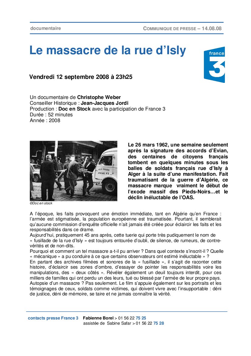le documentaire sur le massacre du 26 mars 1962 sera diffusé le Vendredi 12 septembre 2008 à 23h25 ( voir le communiqué de presse de FRANCE 3 en PJ)