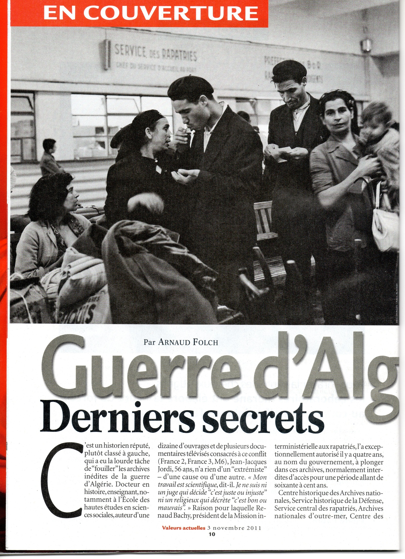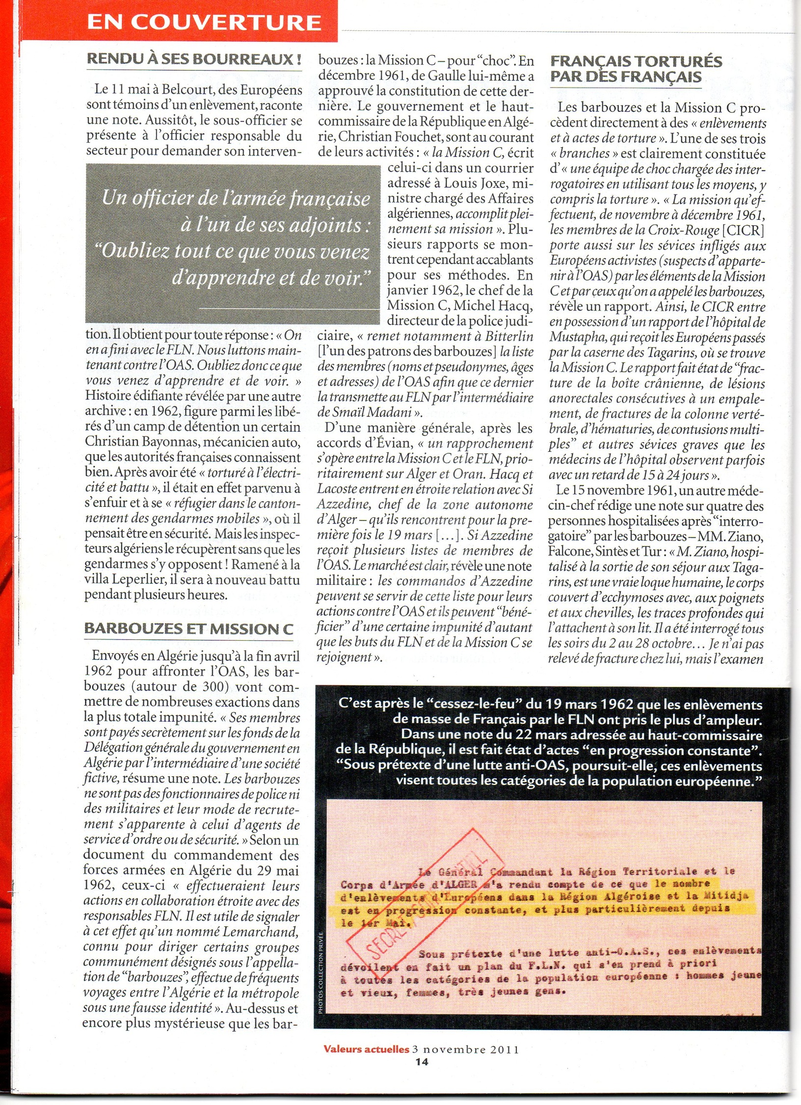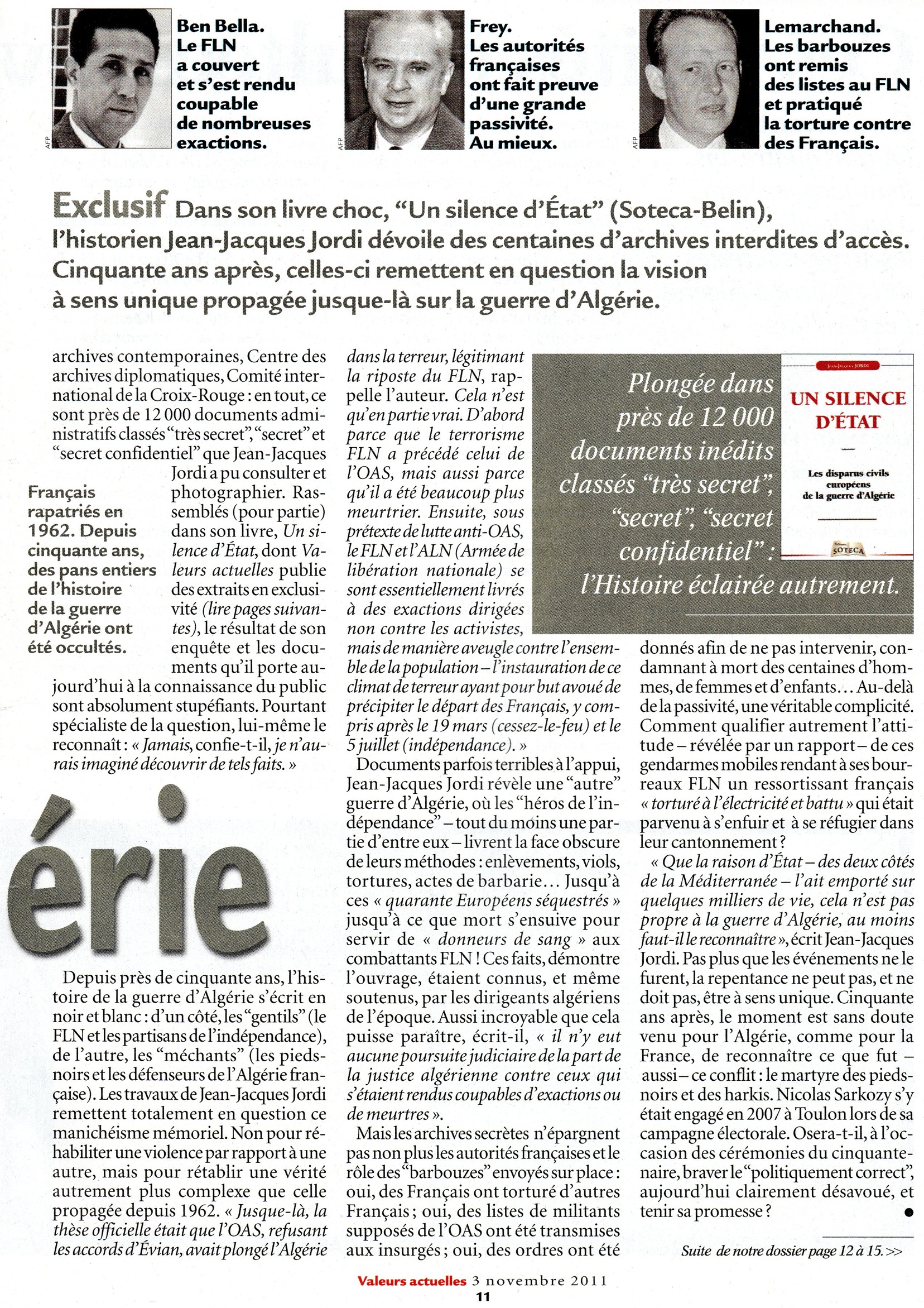 Un article très fort de Valeurs Actuelles, paru le jeudi 3 novembre, à propos du livre de l’historien Jean-Jacques Jordi "Un silence d’Etat".
