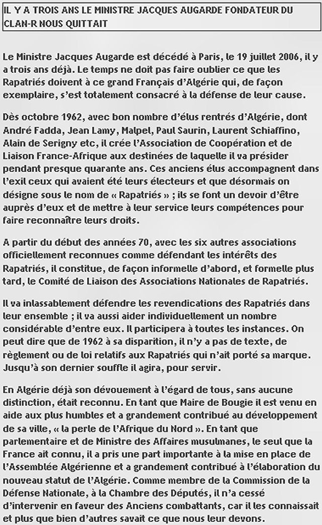Pour lire l’hommage qu minisre AUGARDE par le président Denis FADA,cliquer sur le lien ; http://www.clan-r.org/portail/"
