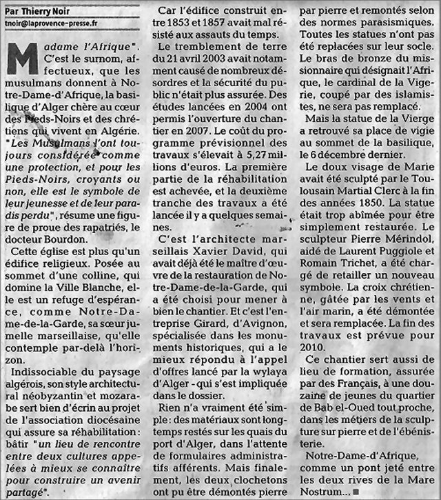 Comment argumenter cette nouvelle ? On ne peut que se réjouir de savoir que Notre Dame d’Afrique continue, contre vents et marées à dominer cette superbe baie d’Alger, et à rappeler la présence Française et Chrétienne sur note pays l’Algérie.