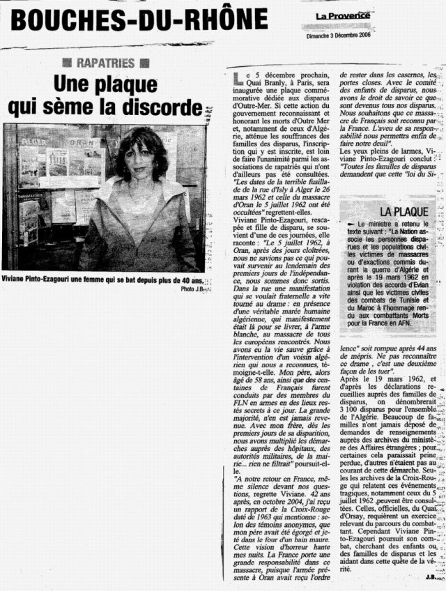 La Provence 3-12-06 Plaque du 5 décembre Quai BRANLY Lundi 4 décembre 2006, par MORA , popularité : 5% Marseille | 1 | Enfin un peu d’air !!!