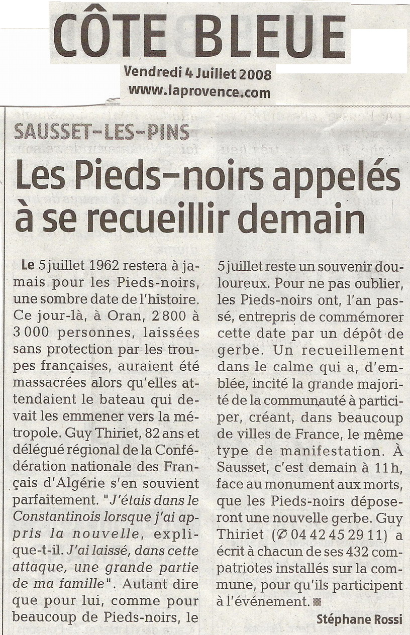 Le 5 juillet !! On en parle avant ! Vendredi 4 juillet 2008, par MORA , popularité : 4% SAUSSET les Pins | 3 | 5 juillet 1962| Actions collectives| Commémorations| Reçu d’un de nos correspondants fidèles !! Si on commence à en parler avant, c’est une très bonne nouvelle !