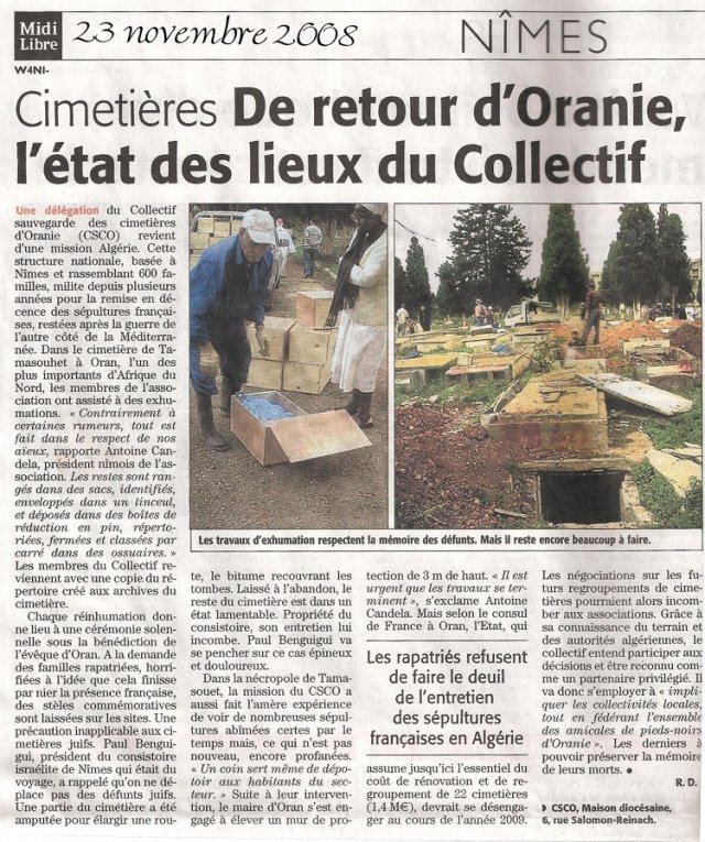 NIMES : le CSCO raconte les cimétières d’ORAN Dimanche 23 novembre 2008, par MORA , popularité : 3% Languedoc Roussillon | 10 | Actions collectives| Commémorations| Histoire| Paru dans la presse locale et pour l’information de tous. Pensez aussi à participer à la pétition sur les cimetières d’ALGERIE (voir LA UNE)