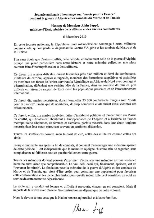 A l’occasion de la journée nationale d’hommage aux « morts pour la France » pendant la guerre d’Algérie et les combats du Maroc et de la Tunisie, Alain Juppé, ministre d’Etat, ministre de la Défense et des Anciens combattants, a rendu hommage à ceux « militaires comme civils », qui y ont perdu la vie.