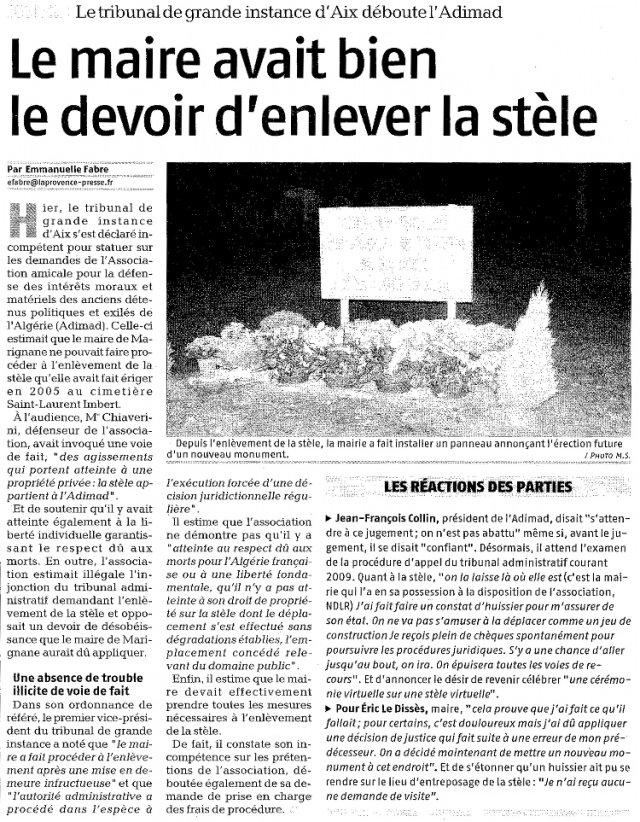 En vue d’obtenir la réimplantation de la stèle, avec décision du Maire ET ratification par le Conseil Municipal ainsi que la constitution d’un petit fonds financier pour attaquer immédiatement toute calamité en justice qui tenterait de nous en empêcher.