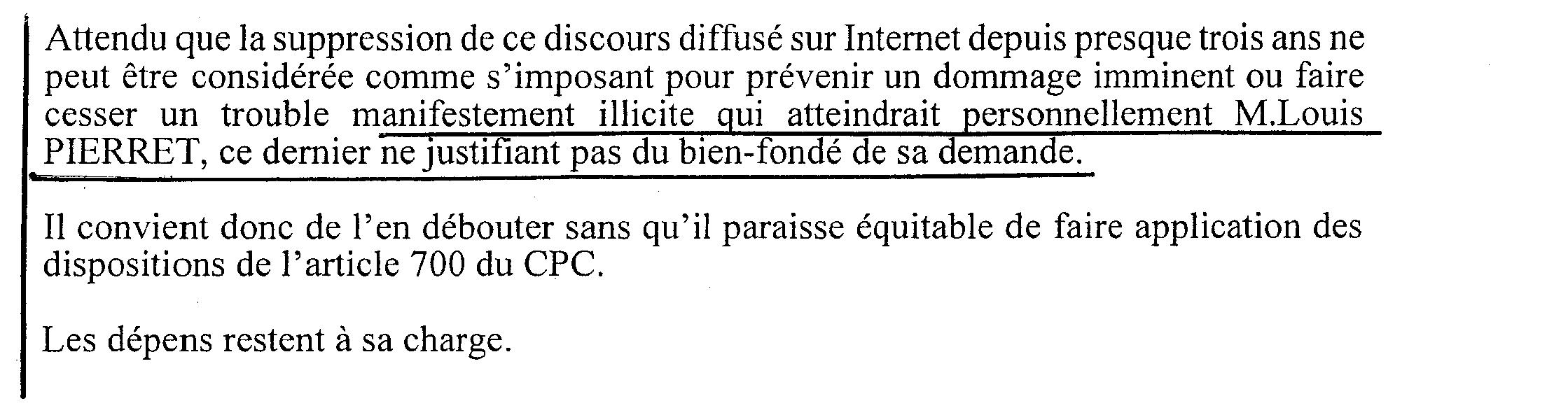 Pour Louis Pierret comme pour de nombreux pieds-noirs, le 19-Mars 1962, jour d’entrée en vigueur des Accords d’Évian, ne peut en aucun cas symboliser la fin de la guerre d’Algérie puisqu’il y eut des milliers de morts et de disparus après cette date. Ce que ne conteste pas le PC, pour qui cependant le 19-Mars marque un tournant dans l’histoire de France. Le tribunal, présidé par Anne-Marie Somnier, a estimé qu’il " ne pouvait juridiquement prendre parti sur le fond du débat". Mais il a jugé que "la suppression de ce discours, diffusé sur internet depuis presque trois ans, ne peut être considéré comme s’imposant pour prévenir un dommage imminent ou faire cesser un trouble manifestement illicite qui atteindrait personnellement M. Pierret."