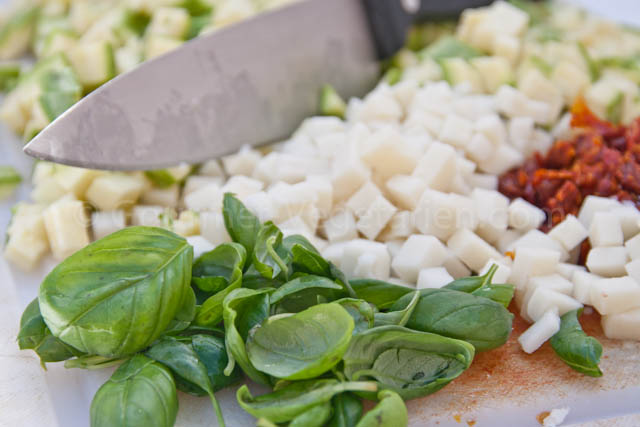 Ajouter alors les autres ingrédients (dés de courgettes et de fromage, tomates découpées et basilic) puis mélanger soigneusement.