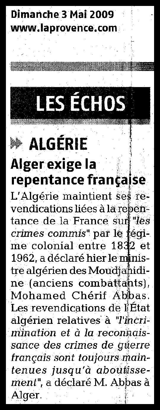 Les revendications de l’Etat algérien relatives à "l’incrimination et à la reconnaissance des crimes de guerre français sont toujours maintenues jusqu’à aboutissement", a déclaré M. Abbas à Alger, en marge du troisième congrès national de l’Association nationale des anciens condamnés à mort (1954-1962), selon l’agence APS.