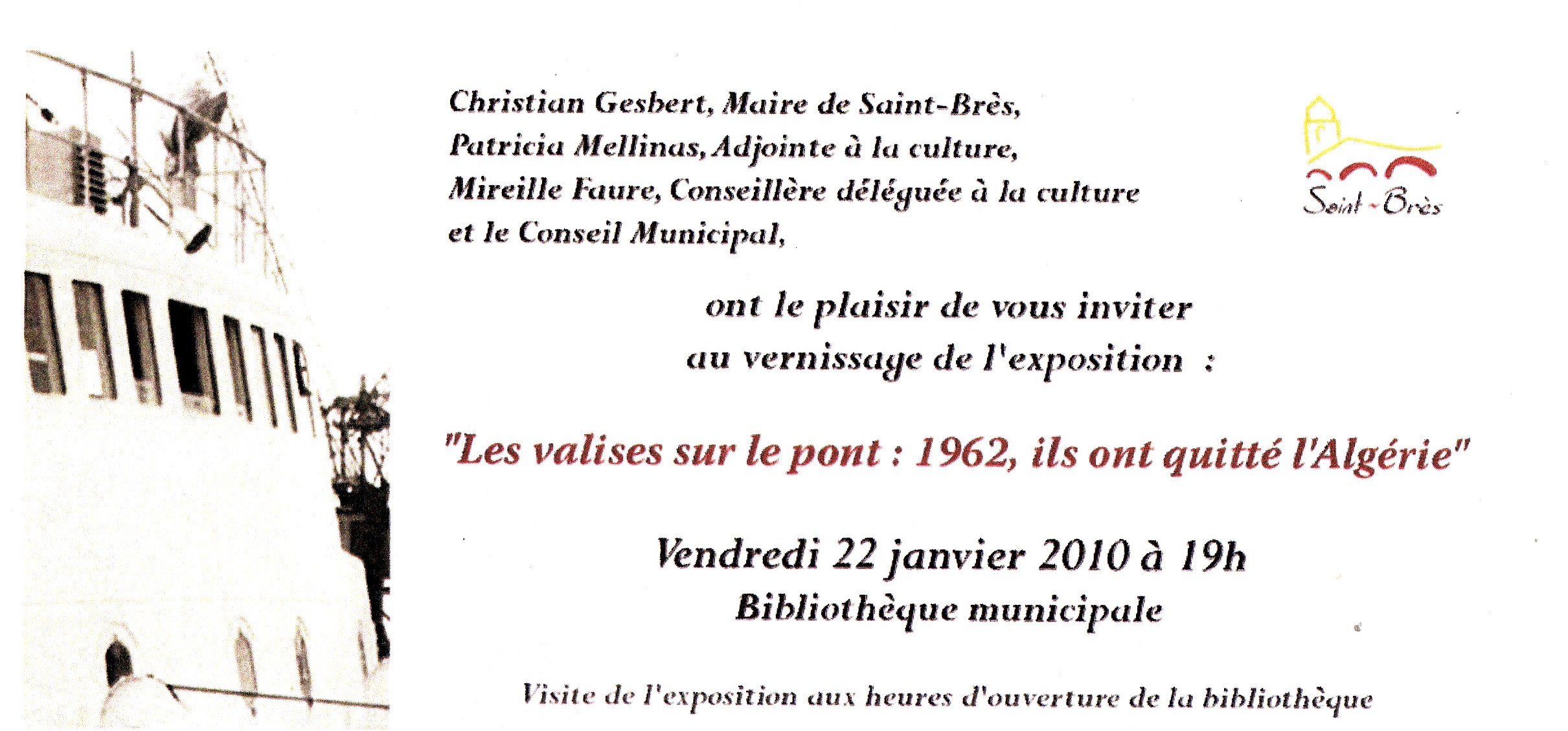 Dans le cadre des actions de préfiguration du Musée Mémorial du camp de Rivesaltes, le Conseil Général des Pyrénées Orientales, propose l’exposition : "Les valises sur le pont : 1962, ils ont quitté l’Algérie", au Palais des Rois de Majorque, 4, rue des Archers, jusqu’au 14 février 2010.
