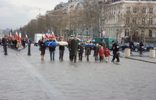 devancé par nos drapeaux, et un groupe d’enfants , garant de notre futur.