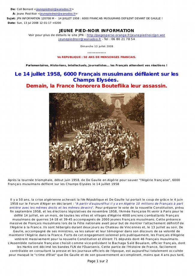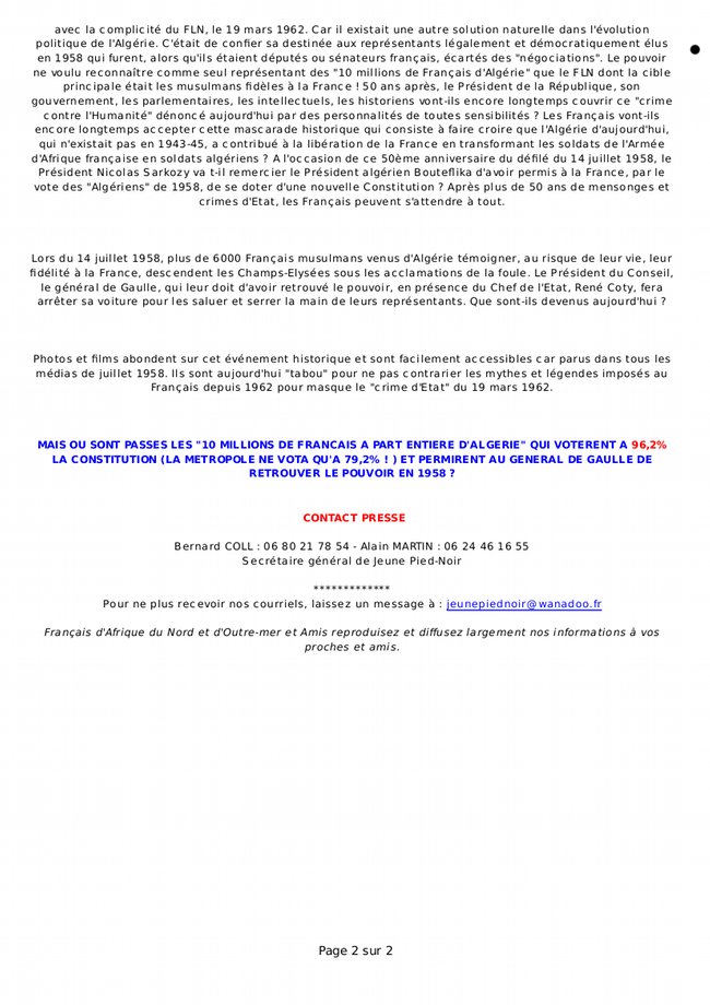 Jeune Pied-Noir communique Dimanche 13 juillet 2008, par MORA , popularité : 3% Communiqués d’Associations | 13 mai 1958| Actualités associations| Communiqués de Presse| Histoire| Diffusé par mail collecitf.