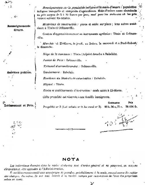 Nature du terrain : sablonneux dans la partie Nord, argilo-calcaire dans la partie Sud avec quelques affleurements rocheux : parcelles en friche (broussailles et palmiers nains). L’acheteur est soumis à obligation de mise en valeur : culture, cheptel, construction des bâtiments nécessaires à l’exploitation.