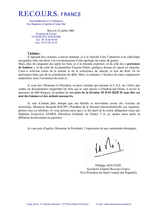 Le RECOURS communique "Porteuses de feu" FR3 CSA Mercredi 16 juillet 2008, par MORA , popularité : 4% Communiqués d’Associations | 42 | Actualités associations| Communiqués de Presse| Histoire| Télévision| Documents reçus et aménagés pour diffusion d’information. Comprend : – Note d’information de Mr NOUVION – Réponse du CSA – Réponse de Mr NOUVION à la lettre du CSA. __espaceur.png__ __espaceur.png__