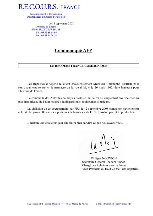 Le Recours communique au sujet du film sur le 26 mars 1962 - FR3