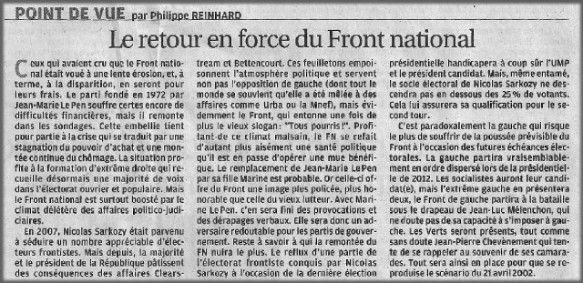 Ces feuilletons empoisonnent l’atmosphère politique et servent non pas l’opposirion de gauche (dont tout le monde se rappelle qu’elle a été mêlée à des affaires comme Urba ou le Mnef) mais évidemment le Front qui entonne une fois de plus le vieux slogan : "Tous pourris !". Profitant de ce climat malsain, le FN se refait d’autant plus une santé politique qu’il est en passe d’opérer une mue bénéfique.