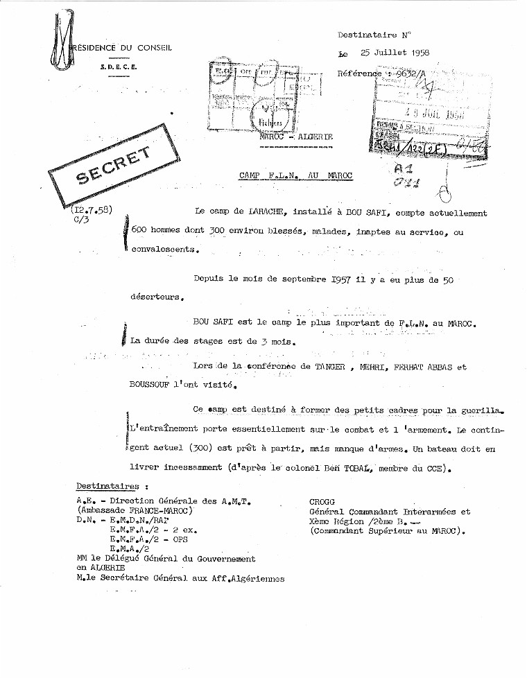 En outre, de nombreux agents du renseignement français "travaillaient sur Tanger" qui était alors un haut lieu du trafic international en tous genres et donc, une place forte de l’approvisionnement en armes du FLN algérien ... avec la tacite bénédiction de l’état marocain, souteneur de l’action de l’ALN algérienne résidant sur son sol avec armes et bagages ... aux fins de leur permettre, par delà la frontière, de combattre efficacement la France en Algérie française ...
