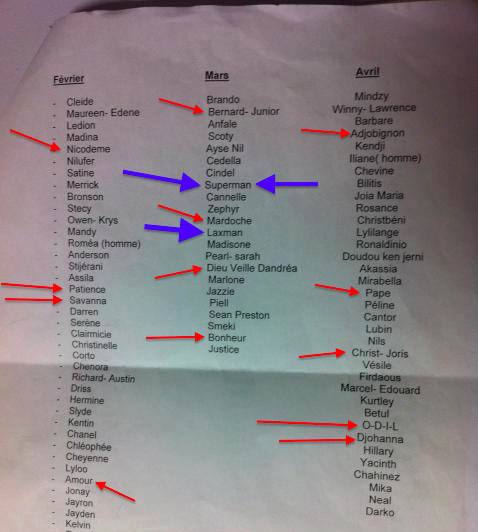 Pour les garçons : Emeraude, Superman, Papa, Amour, Charlot, Playboy, Don Béni, Chandler, Expert, Christ-Joris, Bernard Junior.