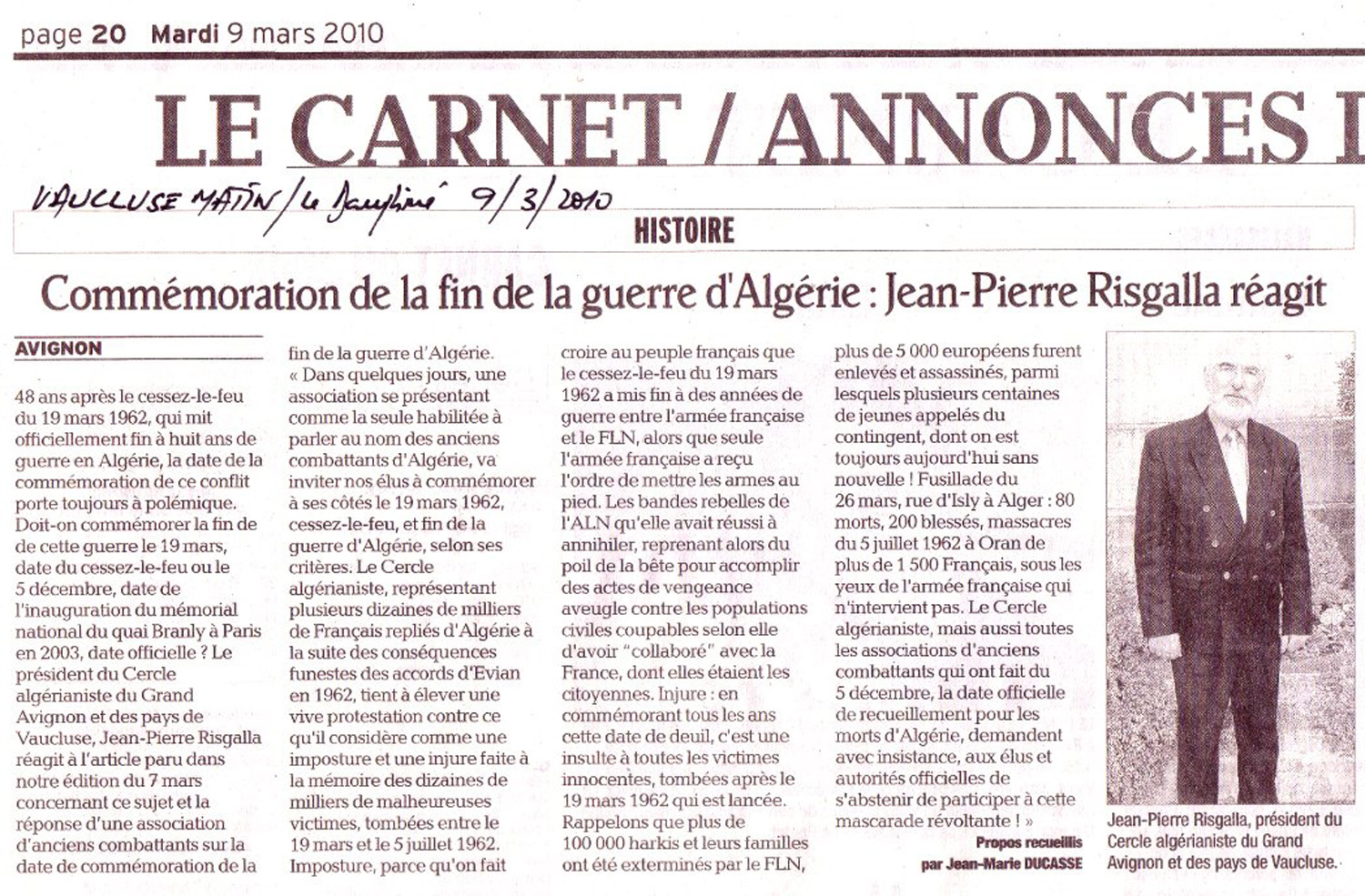 Le 19 mars se rapproche et si la FNACA rappelle le ban l’arrière ban, nous constatons que les associations représentant la communauté Pieds-Noirs s’accordent sur ce point : NON AU 19 MARS, comme le montre l’article du Dauphiné Libéré.