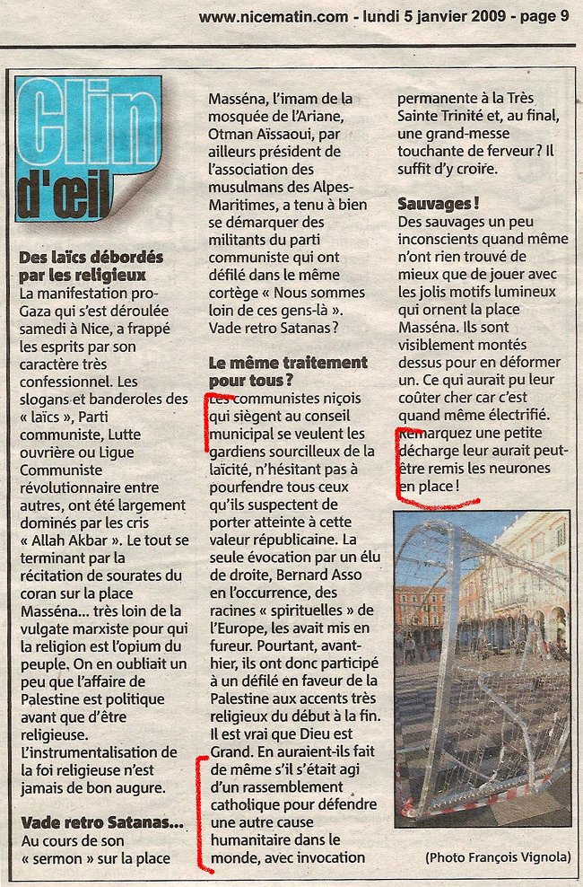 Nice Matin vire sa cuti ? Mardi 6 janvier 2009, par MORA , popularité : 4% NICE | 2 | La Presse| Société| .. envoyé par Jacqueline PEREZ.. Troublant cet article de NICE MATIN. n’est-ce pas ? Quand on connaît les dominantes politiques locales, certains mots peuvent surprendre, gardons donc espoir pour cette belle Ville !