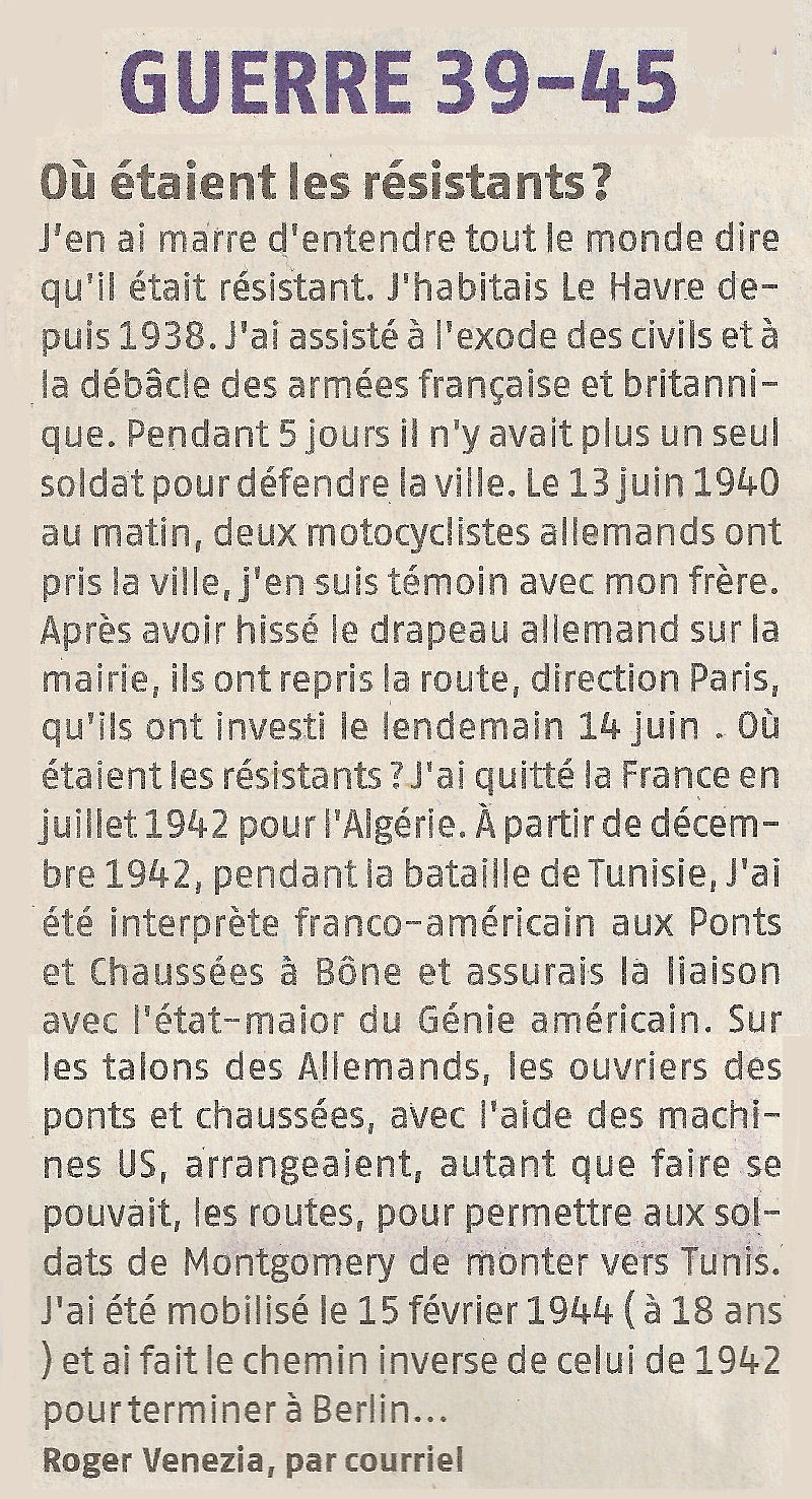 En complément de ce témoignage, il me parait équitable de rappeler que pendant cette bataille de Tunisie qui a débuté dès décembre 1942, il y avait aussi l’armée française constituée par tous les hommes valides d’Algérie, les plus jeunes entrainés dans le cadre des "chantiers de jeunesse"