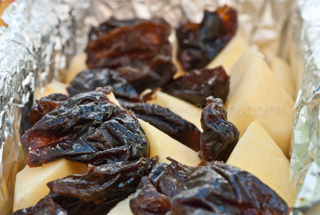 Disposer une couche de pommes dans le fond, bien serrées, puis disposer une couche de pruneaux par-dessus.