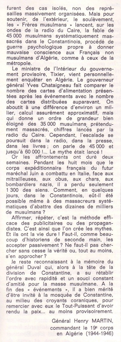 Le Général Henry Martin commandant le 19e Corps en Algérie de 1944 à 1946 donne sa version des faits et dénonce la propagande qui a été faite par les indépendantistes de l’Algérie.