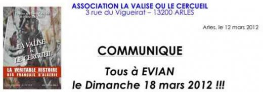 Objet : Manifestation du Dimanche 18 mars 2012 devant le Palais des Festivités d’Evian pour soutenir l’histoire des Français d’Algérie et le film "La valise ou le cercueil" de Charly Cassan et Marie Havenel.