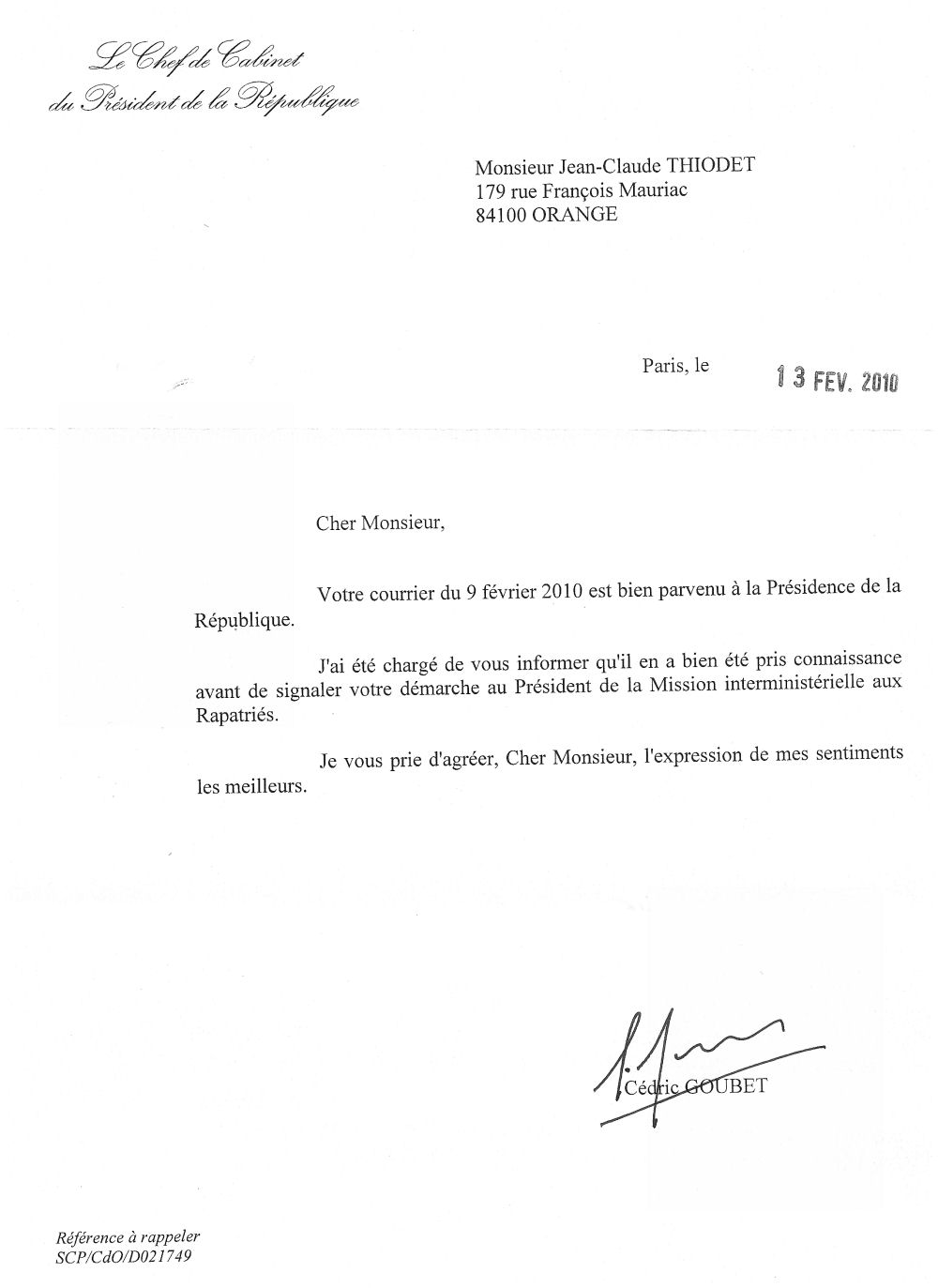 Je vous remercie, Monsieur le Président de la République d’avoir prêté attention à mes propos et vous prie d’agréer mes respectueuses salutations.
