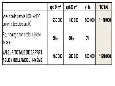 En fait, Hollande estime que ces biens immobiliers valent 1 540 000 € mais il ne déclare pas tout profitant de cette niche fiscale, comme le montre le tableau ci-dessous.