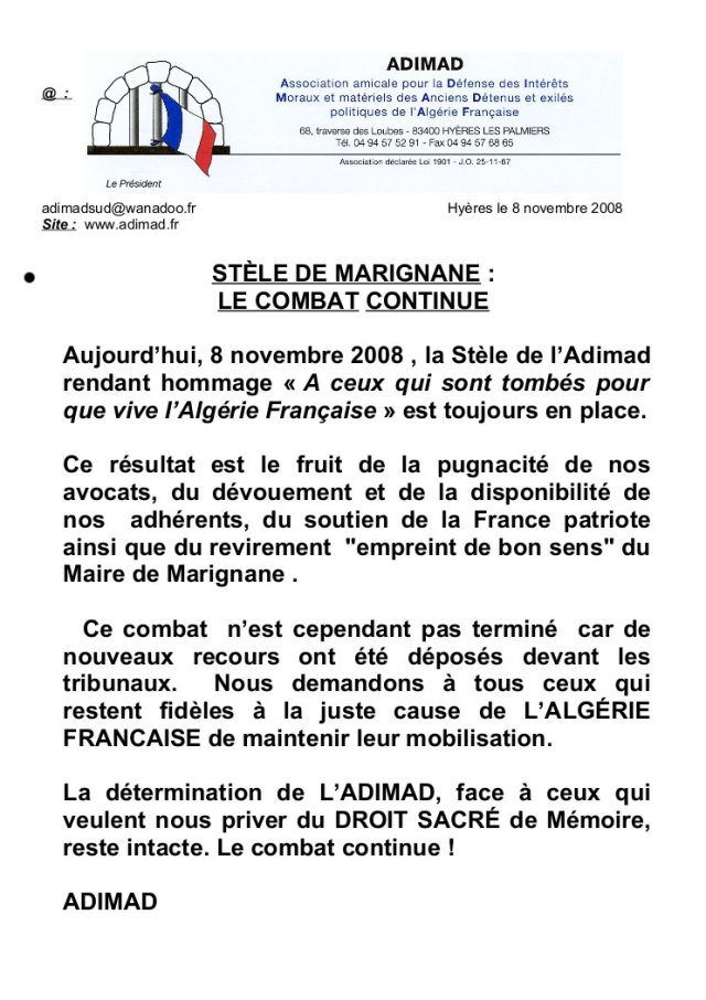 ADIMAD - Marignane communique Samedi 8 novembre 2008, par MORA , popularité : 3% Communiqués d’Associations | 15 | Communiqués de Presse| OAS| Reçu de l’ADIMAD