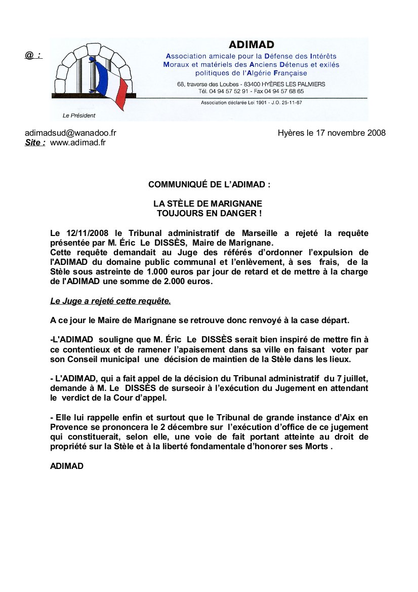 ADIMAD Marignane - communiqué de JF Collin 17-11-08 Lundi 17 novembre 2008, par MORA , popularité : 4% Communiqués d’Associations | Commémorations| Guerre d’Algérie| OAS| L’ADIMAD diffuse