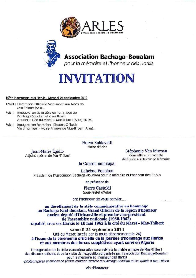 Bachaga Boualam ARLES : 25 septembre 2010 Samedi 25 septembre 2010, par MORA , popularité : 3% Bachaga BOUALAM | Actualités associations| Agenda| Commémorations| Harkis| ... Invitation reçue par mail ...