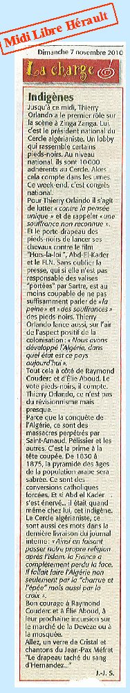 Narbonne, le 10 novembre 2010,Monsieur Arnaud BOUCOMONTRédacteur en chef MIDI-LIBRERue Alfred de Musset34500 - BEZIERSMonsieur le rédacteur en chef,Il est des journalistes militants et pourtant honnêtes intellectuellement.Force est de reconnaître à la lecture de l’article, paru dans votre édition de Béziers en date du dimanche 7 novembre 2010, au sujet du 37e congrès national du Cercle algérianiste qui s’est déroulé du 5 au 7 novembre à Béziers, que votre correspondant biterrois, M. Jean-Jacques Sarciat, s’il entre dans la première catégorie, n’appartient pas à la seconde.M. Sarciat semble, en effet, avoir une conception particulière du journalisme. N’ayant absolument pas suivi et couvert les travaux de ce congrès qui ont réunis plus de 1500 délégués au Zinga Zanga de Béziers, il réduit, par un jugement partisan, à une caricature non seulement les positions du Cercle algérianiste, mais aussi les raisons des souffrances et des drame des Français d’Algérie.Il est totalement inacceptable que M. Sarciat se soit laissé guider par son seul mépris des Français d’Algérie pour commettre cet article et ait préféré, plutôt que d’aller plus loin dans la compréhension de notre drame, énoncer quelques idées éculées sur la colonisation pour le rédiger.Quant au terme « révisionniste » employé à mon égard, terme dont chacun devine la connotation qu’il comporte, je crains que M. Sarciat ne soit orfèvre en la matière, lui qui, précisément, ne semble vouloir reconnaître de souffrances que d’un seul bord et tourner en dérision ceux qui défendent les victimes d’une communauté meurtrie et blessée par l’Histoire, les Pieds-Noirs.Les 13 000 Français d’Algérie présents dans le Biterrois, de même que tous nos compatriotes, Français d’Algérie et Harkis du Languedoc apprécieront les propos de ce journaliste qui malheureusement entache l’image du Midi Libre.Je ne sais si les positions du journaliste précité qui ont choquées un très grand nombre de Français d’Algérie de votre région sont le reflet des positions du Midi Libre.Je vous serais reconnaissant de bien vouloir m’indiquer si ces propos sont assumés par votre journal, ce qui nous permettra d’en informer l’ensemble de nos compatriotes du Languedoc.D’ores et déjà, le Cercle algérianiste a décidé d’entreprendre une très large diffusion auprès des 200 associations pieds-noires et harkies du Languedoc, de l’article de M. Sarciat et de notre mise au point qu’il reproduira dans notre revue nationale l’algérianiste, afin que ses 12 000 lecteurs en soient informés.Je vous remercie de bien vouloir me faire connaître la position exacte de votre journal à la suite de cet article militant et caricatural.Dans cette attente, recevez Monsieur le rédacteur en chef, mes salutations distinguées.Thierry RolandoPrésident national du Cercle algérianisteAssociation culturelle des Français d’Afrique du NordB.P. 213 – 11102 Narbonne Cedex – Tél. 04 68 32 70 07 – Fax 04 68 90 78 05Courriel : secretariat@cerclealgerianiste.asso.fr