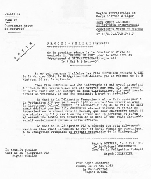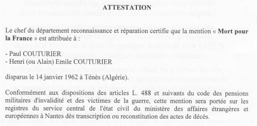 Enlevés à Ténès le 14 janvier 1962 par des terroristes FLN Retrouvés ligotés, ventres ouverts, égorgés et émasculés Ignominie des pouvoirs publics ayant refusé de restituer les corps Fin 2011, soit près d’un demi-siècle après ces crimes de guerre MORTS POUR LA FRANCE</center "...leurs noms doivent figurer sur les stèles officielles afin que André TROISE |