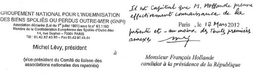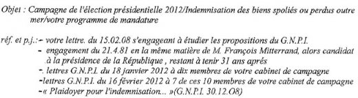 Le Groupement national pour l’indemnisation des biens spoliés ou perdus outre mer (G.N.P.I.) mandataire au moins moral de quelque deux millions de citoyens, s’adresse à vous en votre qualité de candidat à la très prochaine élection présidentielle.