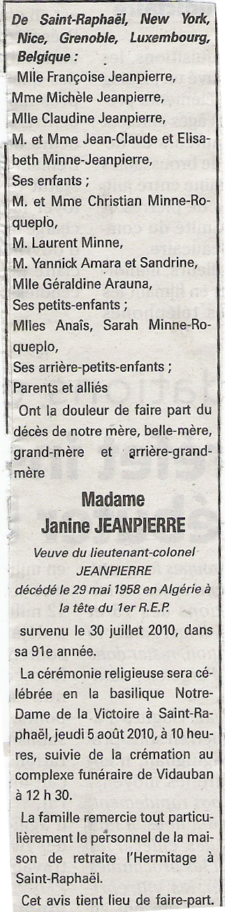 Voir en ligne : Qui était le Colonel JEANPIERRE, son époux ?