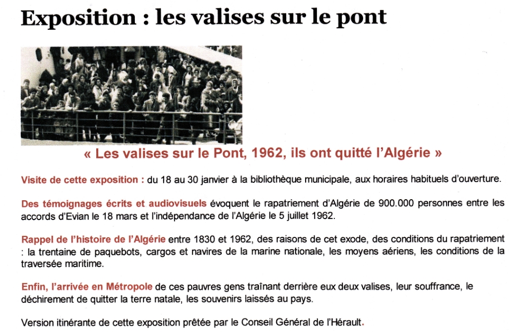 Dans le cadre des actions de préfiguration du Musée Mémorial du camp de Rivesaltes, le Conseil Général des Pyrénées Orientales, propose l’exposition : "Les valises sur le pont : 1962, ils ont quitté l’Algérie", au Palais des Rois de Majorque, 4, rue des Archers, jusqu’au 14 février 2010.