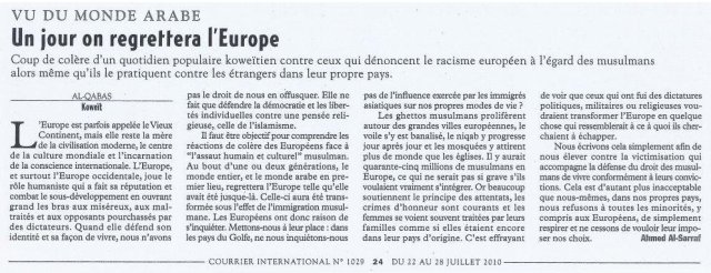 Cet article me laissant sceptique et craignant que ce soit l’oeuvre d’un quelconque faussaire (bien pensant ,tout de même) j’ai fait une recherche rapide sur Google.Le numéro 1029 du Courrier International existe bien et l’article cité est bien celui-ci.Quant à Ahmed Al-Sarraf,il existe aussi.