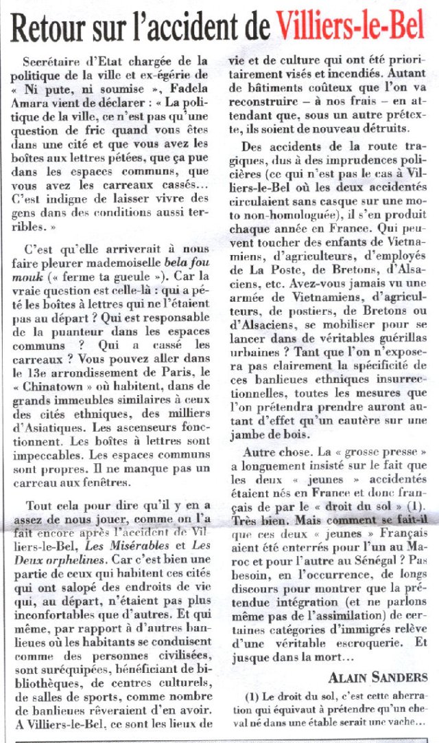 En fait, Mademoiselle Fadela AMARA, qui n’est certes, ni pute ni soumise, n’a peut être jamais connu sa cité dans l’éclatante fraicheur de sa jeunesse ! (celle de la cité, veux-je dire). Ce qui tendrait à vouloir dire que les dégradations auraient commencé il y a déjà longtemps, et qu’elle n’aurait pas eu le loisir d’en reconnaitre les auteurs !! Mais cela n’est pas grave ! On peut lui raconter ce qui s’est passé !! Les médias sont faits pour cela, non ?