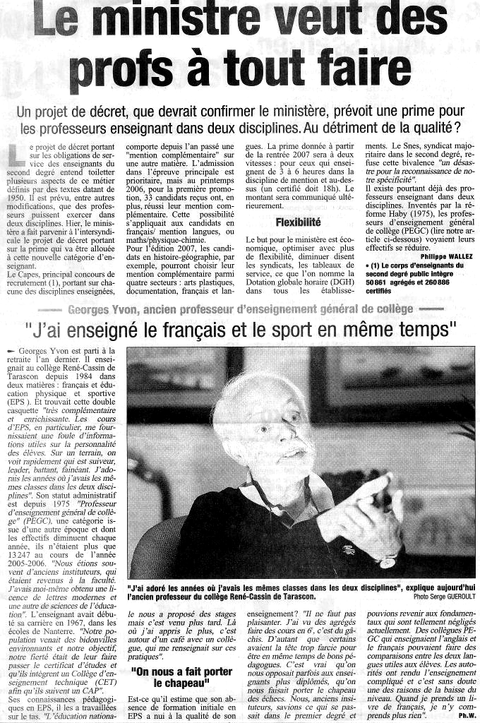 LE MINISTRE VEUT DES PROFS A TOUT FAIRE Dimanche 3 décembre 2006, par Jean Claude THIODET ✞ , popularité : 3% Vaucluse |