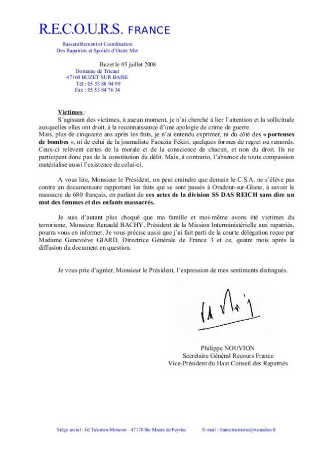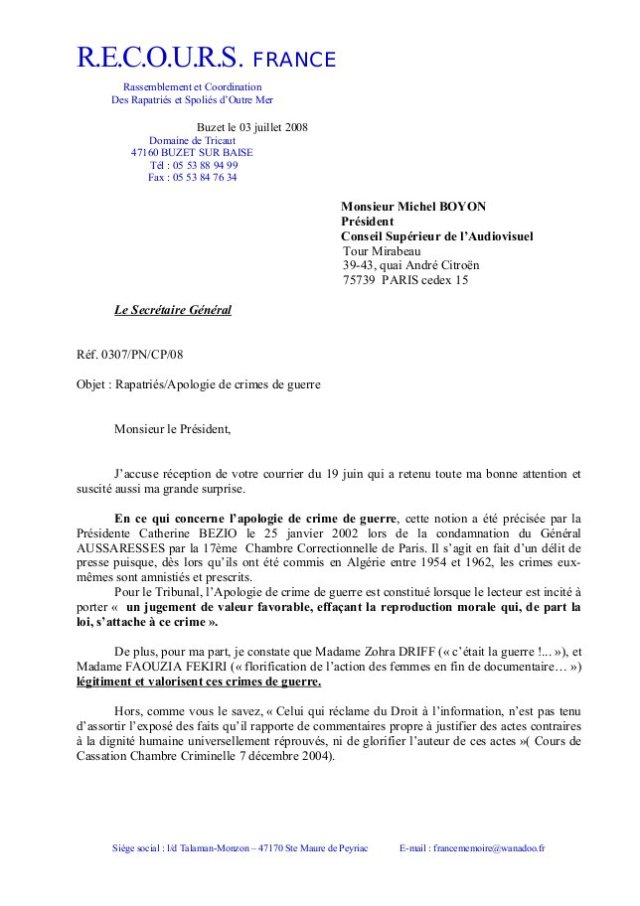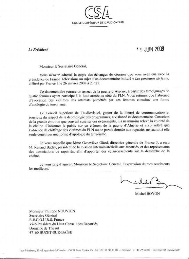 Le RECOURS communique "Porteuses de feu" FR3 CSA Mercredi 16 juillet 2008, par MORA , popularité : 4% Communiqués d’Associations | 42 | Actualités associations| Communiqués de Presse| Histoire| Télévision| Documents reçus et aménagés pour diffusion d’information. Comprend : – Note d’information de Mr NOUVION – Réponse du CSA – Réponse de Mr NOUVION à la lettre du CSA. __espaceur.png__ __espaceur.png__