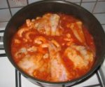 Y ajouter les tomates coupées en dés, au bout de 5 mn ajouter les 25 cl de vin, la même quantité d’eau, saler et poivrer, mettre le bouquet garni, la bisque de homard, le concentré de tomates, et une pointe de couteau de piment de cayenne. Bien mélanger