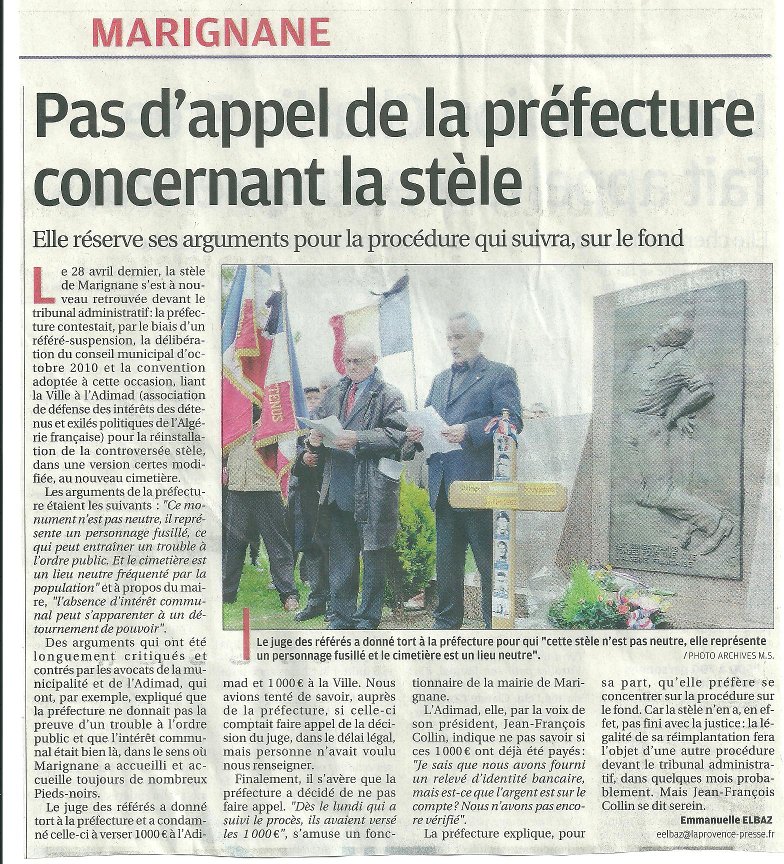 Marignane, dernières nouvelles Samedi 28 mai 2011, par MORA , popularité : 3% ADIMAD | Actualités associations| OAS| ... reçu par mail pour information ....