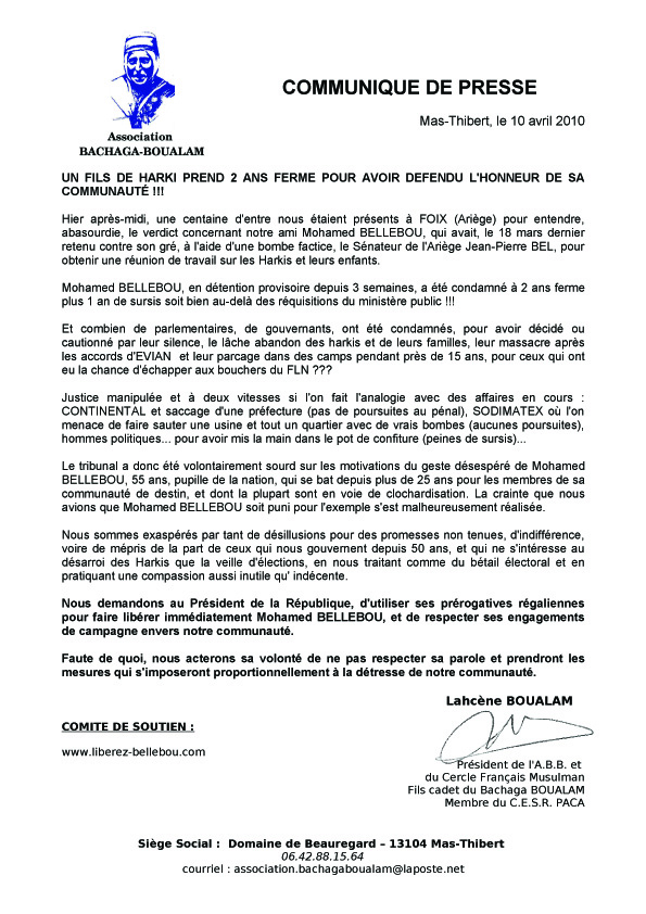 vous trouverez ci-joint le communiqué à faire circuler concernant la condamnation à deux ans ferme de notre ami et compatriote, Mohamed BELLEBOU.