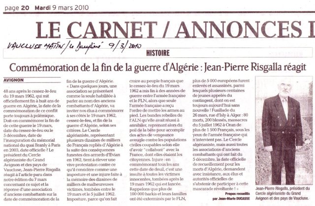 Le 19 mars se rapproche et si la FNACA rappelle le ban l’arrière ban, nous constatons que les associations représentant la communauté Pieds-Noirs s’accordent sur ce point : NON AU 19 MARS, comme le montre l’article du Dauphiné Libéré.