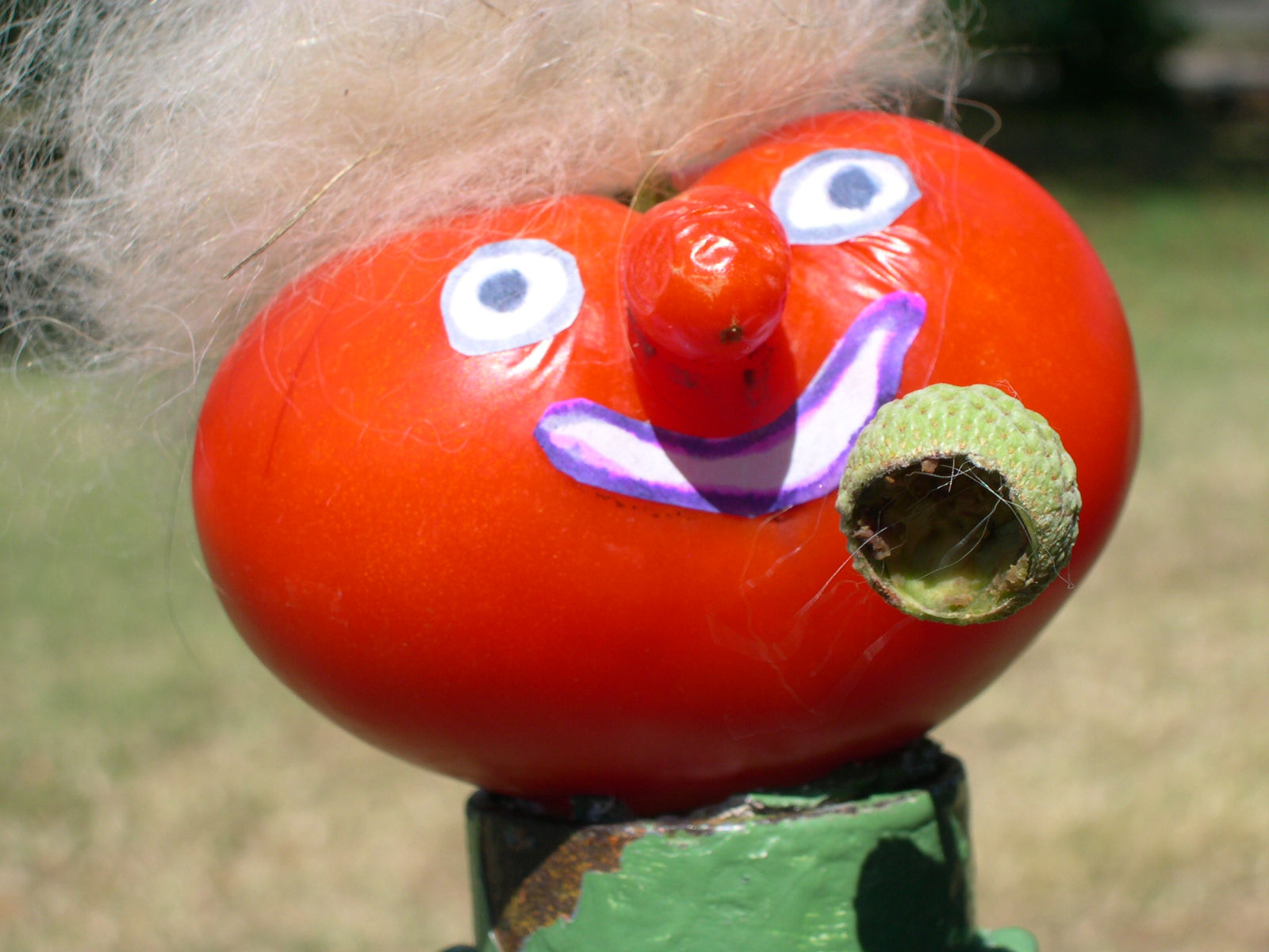 Celle-ci, "la Tomate au nez rouge" de mon jardin a été transformée par un de mes Petits Fils qui voulait qu’elle ressemble à son... Grand Père.